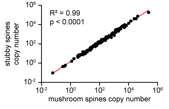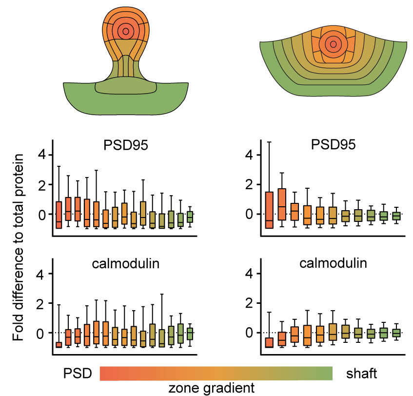 Our microscopy analysis could only show us where proteins are, but not in what quantities. We therefore reasoned that maybe the proteins are present in different numbers. To verify this hypothesis we performed quantitative mass-spectrometry to count the proteins. Surprisingly, there is virtually now different between the two classes. This highlights that any functional differences between these spines can solely be found in their structure, not in their protein composition.